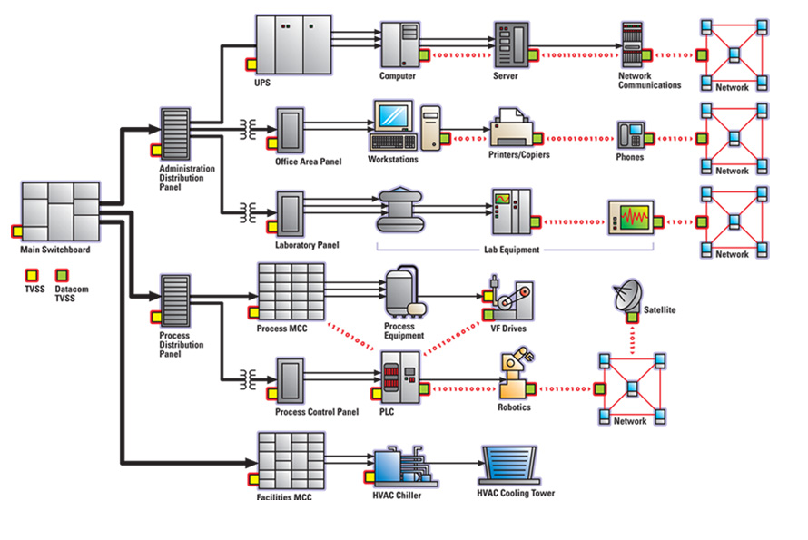 > Supresor contra Transitorios (TVSS) será necesario para proteger los equipos electrónicos de control y comunicación instalados dentro del sistema eléctrico. Los supresores drenan la corriente a tierra y abaten la sobretensión transitoria que puede causar daño. Los transitorios son picos de voltaje con magnitudes desde 2KV y 10KA con duración de nano a microsegundos de aparición aleatoria y bipolar en la onda senoidal. Se pueden clasificar en: